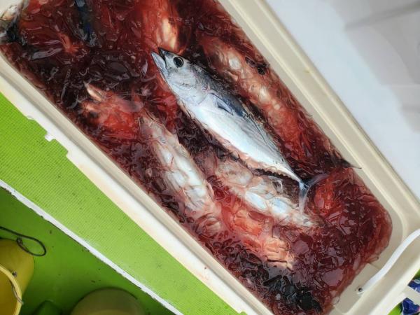 マグロが釣れたお客様は目印付けて船のクーラーへ